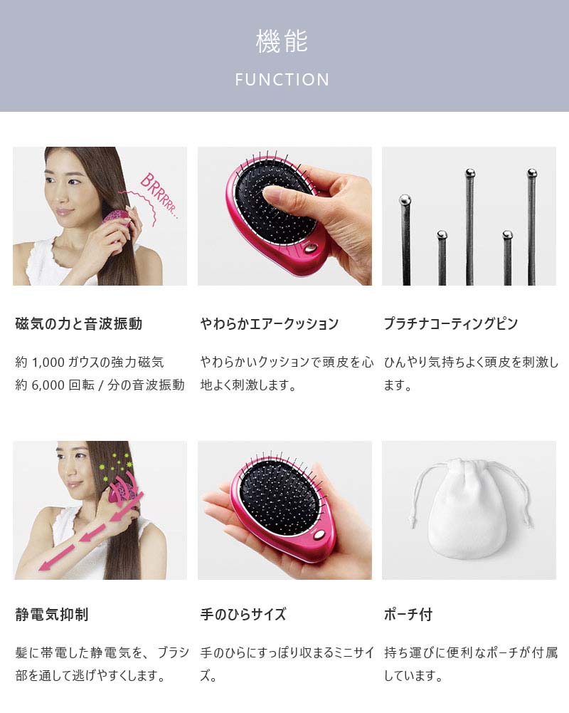 音波振動で髪の絡まりをほぐし、やわらかクッションとメタルピンで頭皮を心地よく刺激。