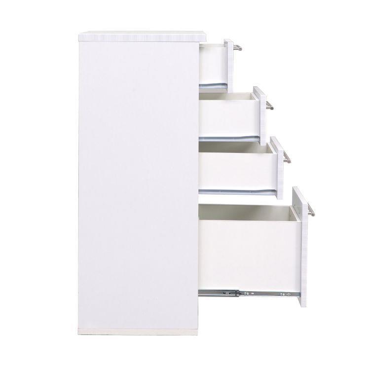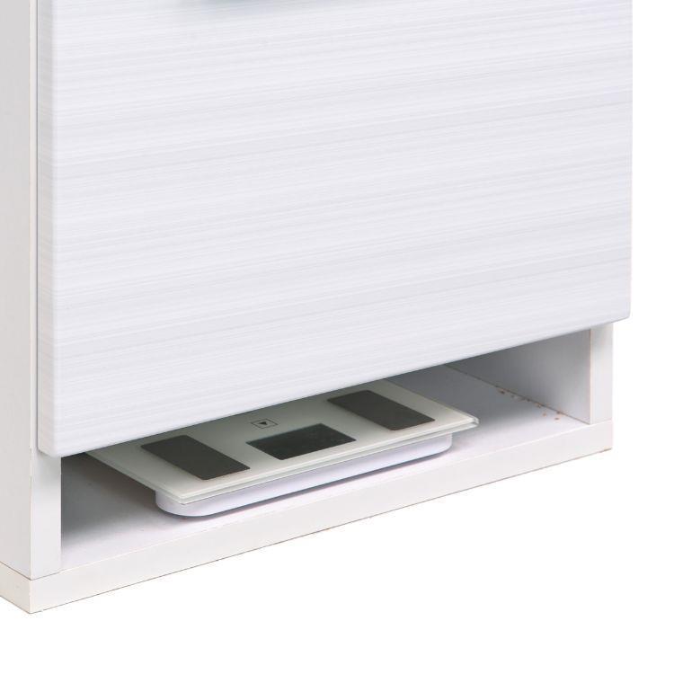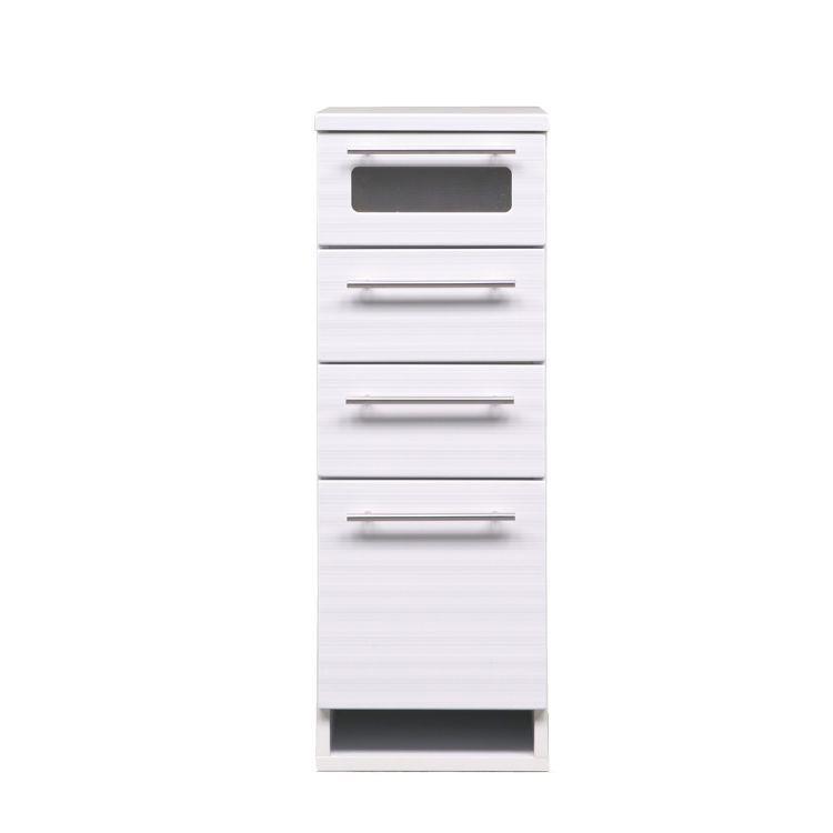 艶やかなホワイトが清潔感を演出するスリムチェスト。丈夫な箱組仕様の引き出しに、最下段はフルオープンレールで出し入れも快適。ヘルスメーター収納スペース付きで、暮らしをすっきり整える4段タイプです。