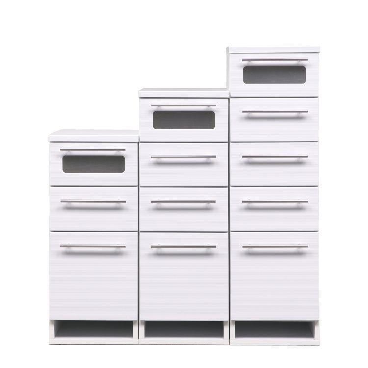 艶やかなホワイトが空間を明るく整えるスリムチェスト。丈夫な箱組構造の引き出しに、最下段フルオープンレールで使い勝手も快適。ヘルスメーター収納スペース付きで、省スペースでもしっかり収納できる5段タイプです。