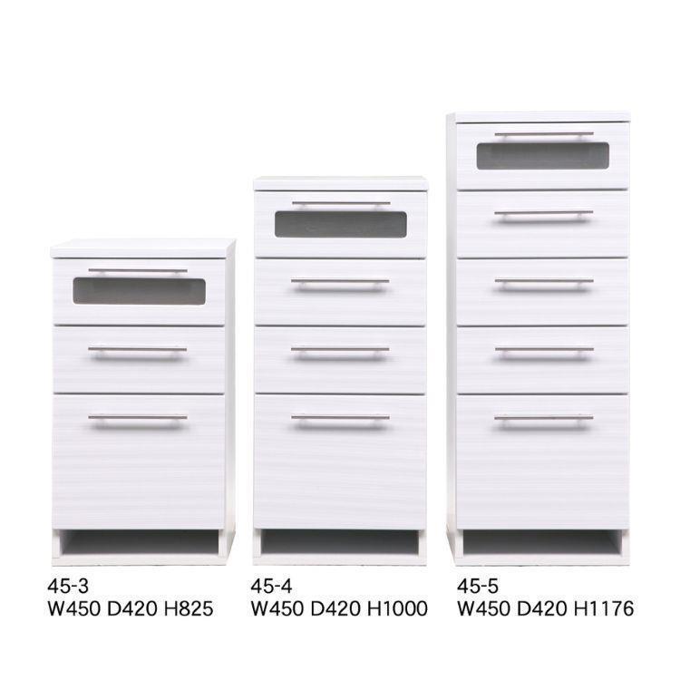 上品な光沢のホワイトが空間を明るく整える45cm幅チェスト。丈夫な箱組構造の引き出しに、最下段はフルオープンレールで出し入れも快適。ヘルスメーター収納スペース付きで、省スペースでもしっかり収納できる5段タイプです。