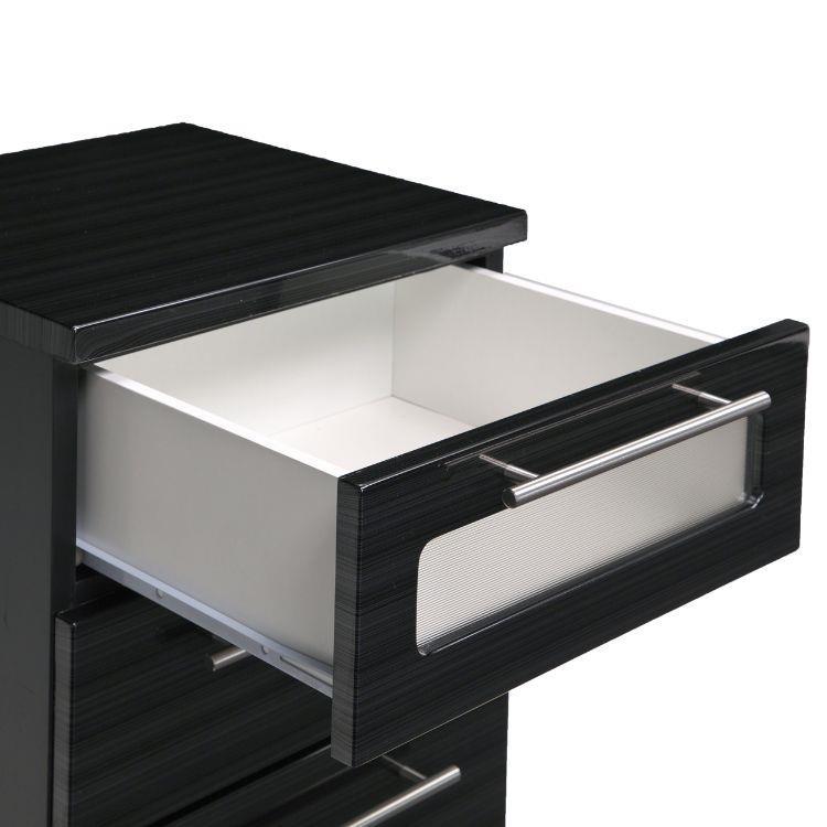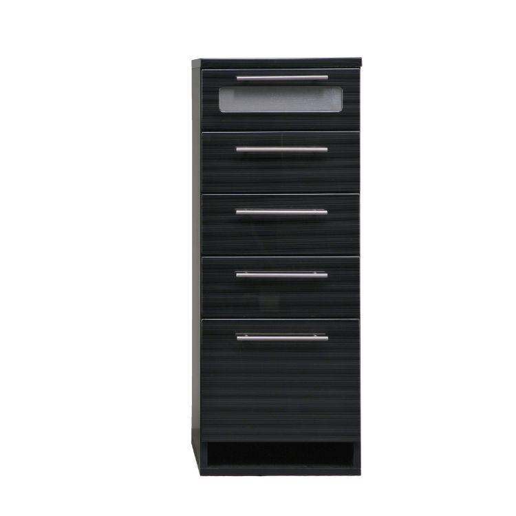 艶やかなブラックが空間をスタイリッシュに演出する45cm幅チェスト。丈夫な箱組構造の引き出しに、最下段フルオープンレールで使い勝手も快適。ヘルスメーター収納スペース付きで、省スペースでもしっかり収納できる5段タイプです。