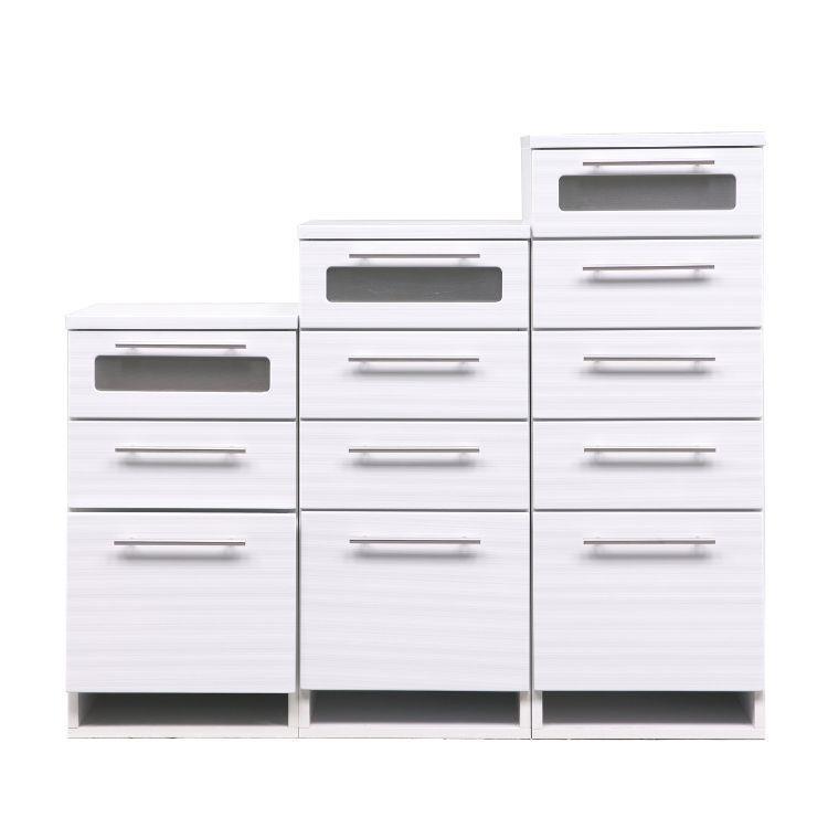 光沢感のあるホワイトが空間をすっきりと見せる45cm幅チェスト。丈夫な箱組仕様の引き出しに、最下段はフルオープンレールで出し入れもスムーズ。収納力と使いやすさを備え、豊富なサイズから選べる安心のシリーズです。