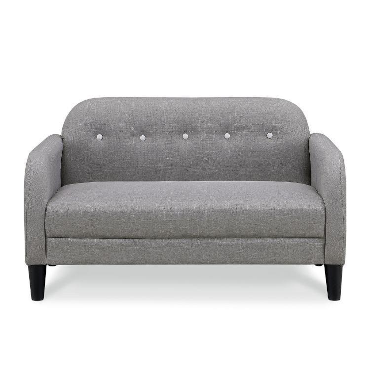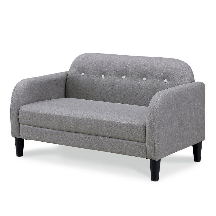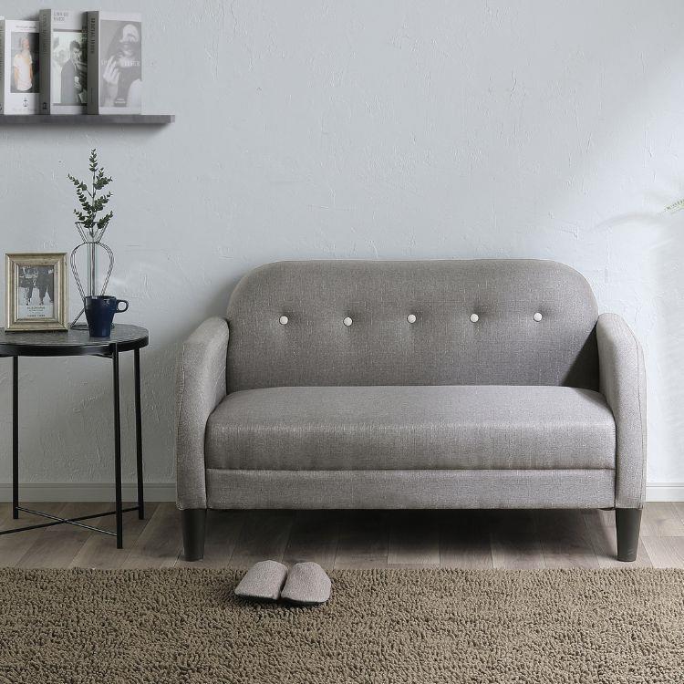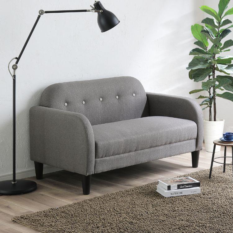 落ち着きのあるグレーカラーと丸みのあるフォルムが、空間に上品さを添える2人掛けソファ。背面のボタンデザインがさりげないアクセントに。コンパクトなサイズ感でお部屋を選ばず、ファブリックの心地よさが快適なくつろぎ時間を演出します。