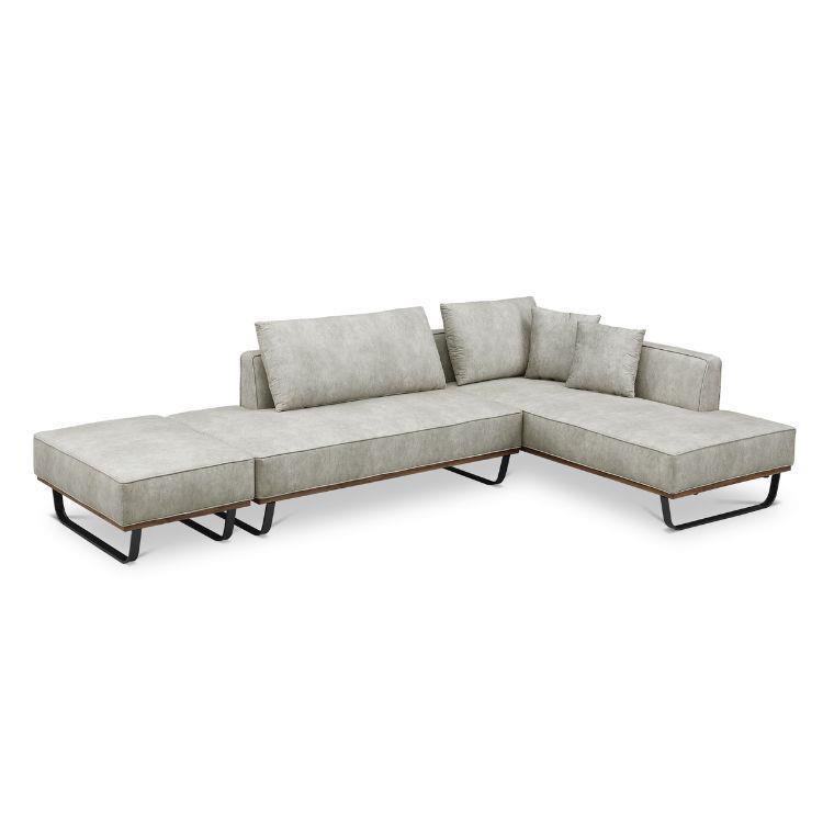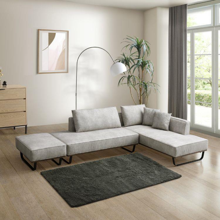 グレーのファブリックに木のアクセントが映える、上質感あふれるカウチソファセット。ゆったりとくつろげるL字レイアウトで、家族団らんも来客時も快適。空間をスタイリッシュに格上げします。