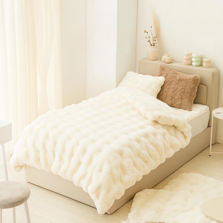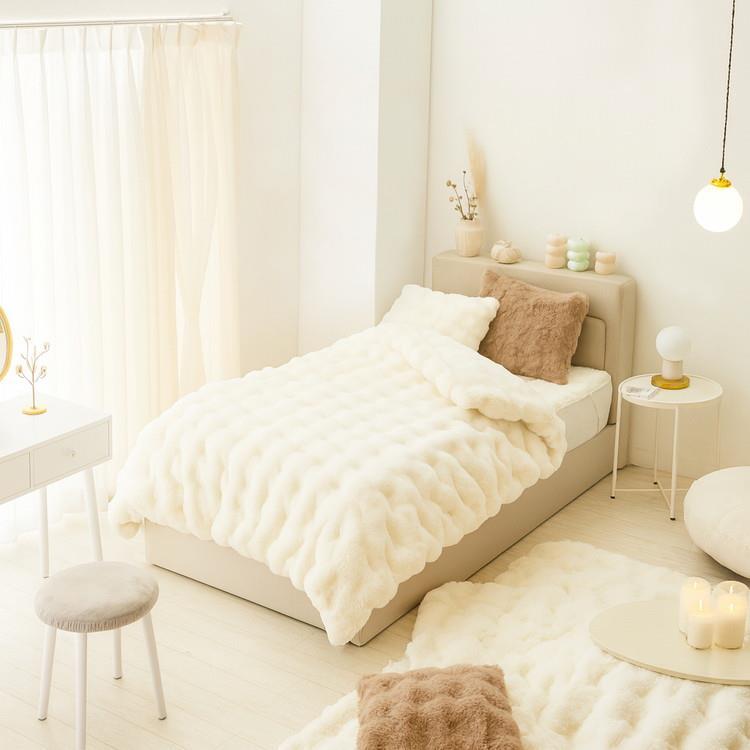 ふわふわ感にこだわり抜いた、2枚合わせのあたたかなプレミアム毛布。表面には柔らかで最高の肌触りのラビットファー、裏面には毛足が短くしっとりとなミンクファーを使用しました。2つの触り心地をお楽しみいただけます。