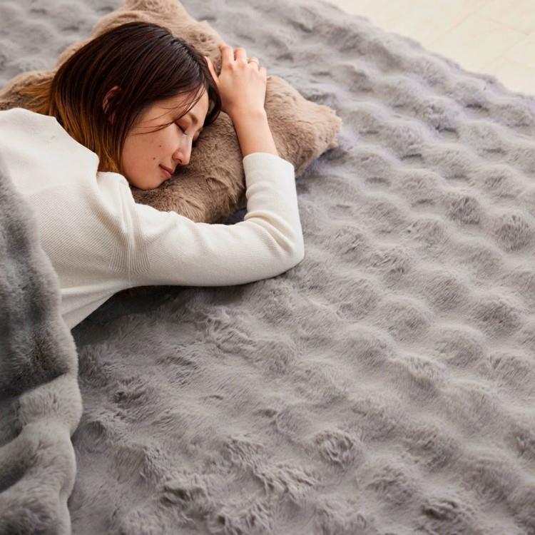 思わず頬ずりしたくなる、ふわもこタッチのプレミアムラグ。なめらかな毛並みとふわふわの肌触りで、床に座る時間が心地良いひとときに変わります。