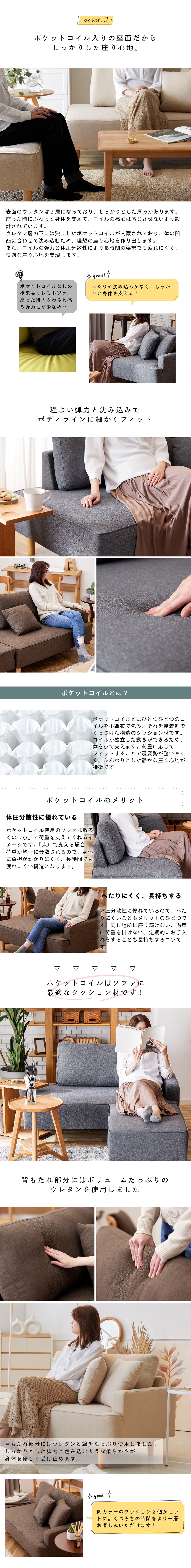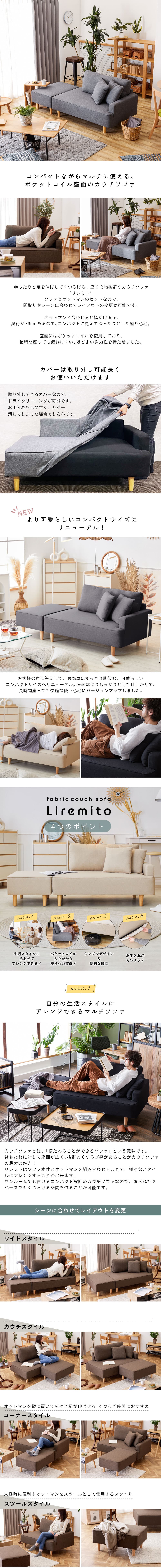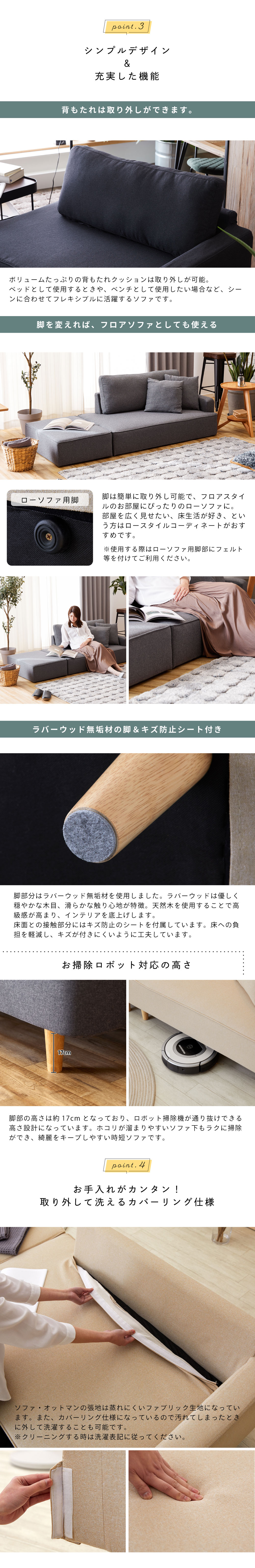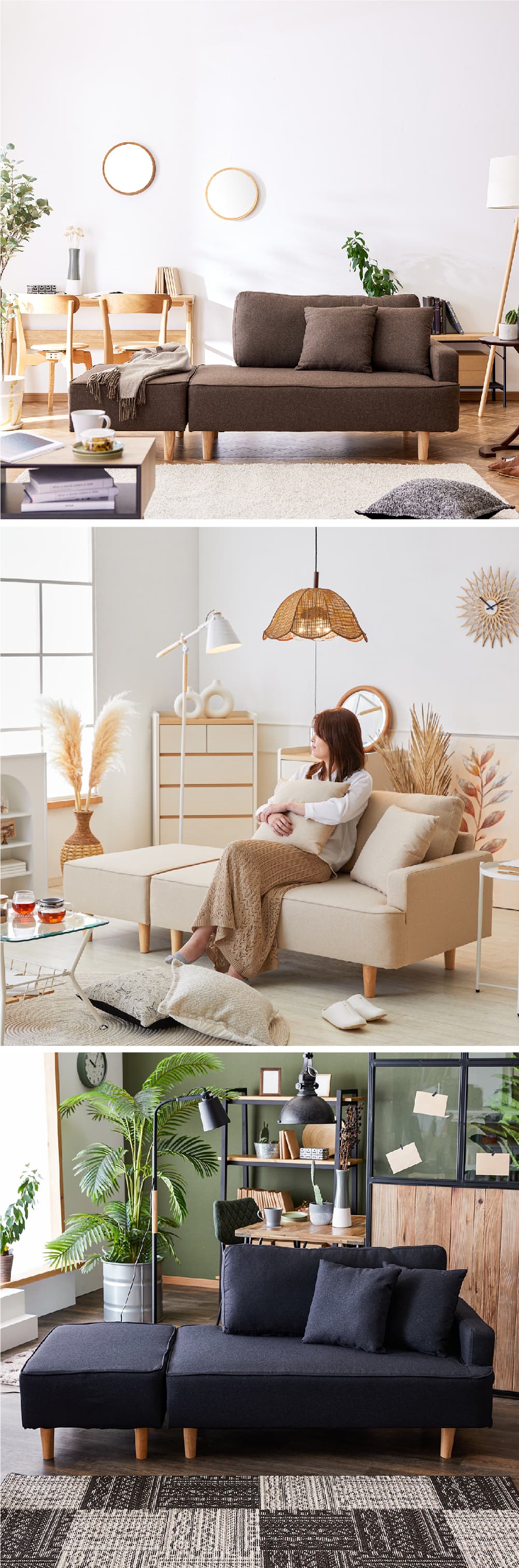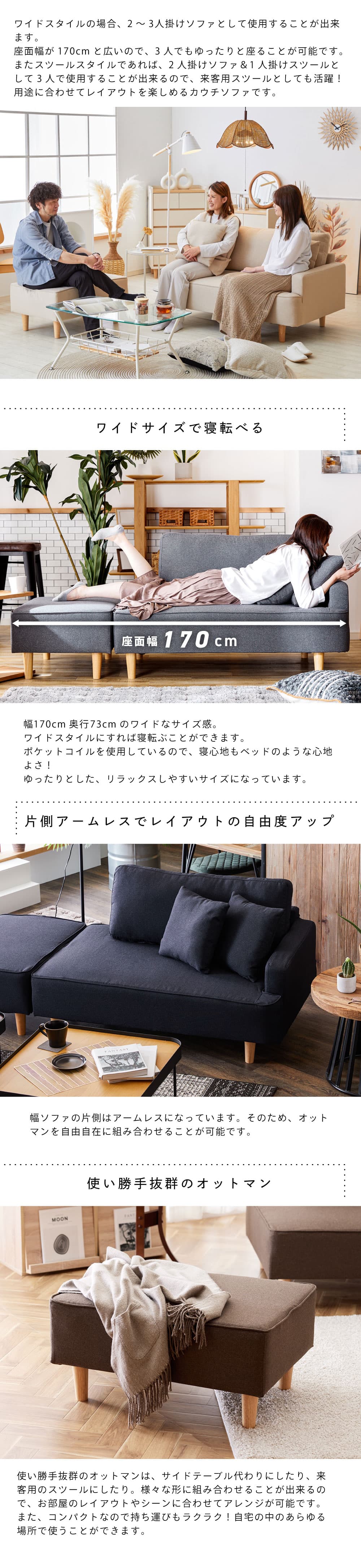 コンパクトサイズでワンルームにもオススメのカウチソファ。ソファ本体とオットマンを組み合わせることで、様々な生活スタイルにあわせたアレンジが可能です。カバーは取り外せるので、万が一汚してしまった場合でも安心です。
