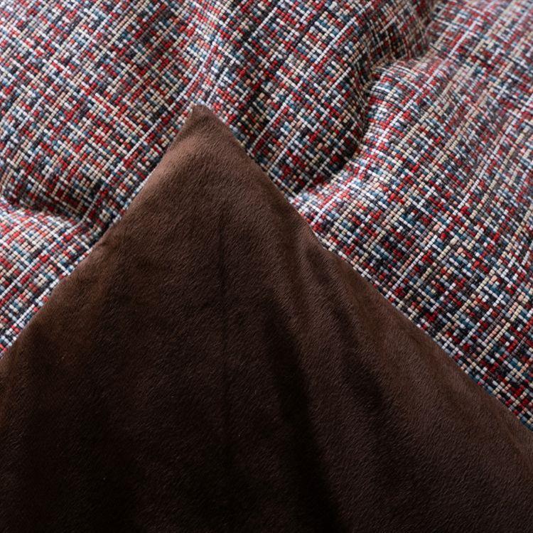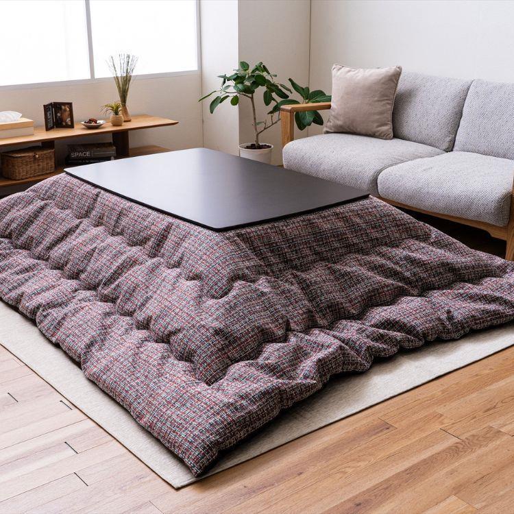 北欧デザインのギャベ柄と鮮やかなレッド色でお部屋を華やかに演出する、大きめのこたつ厚掛け布団です。ずっと触っていたくなる滑らかなミルクファー生地を使用しています。抗菌防臭機能付きのマイティトップ綿入りで、清潔にお使いいただけます。