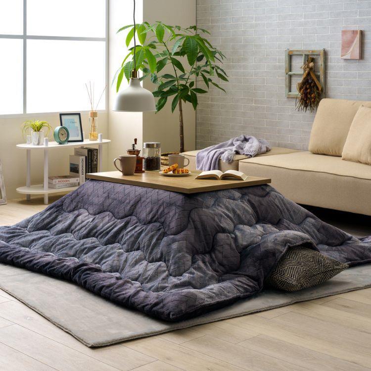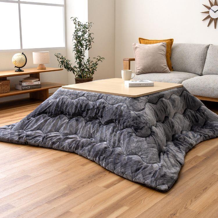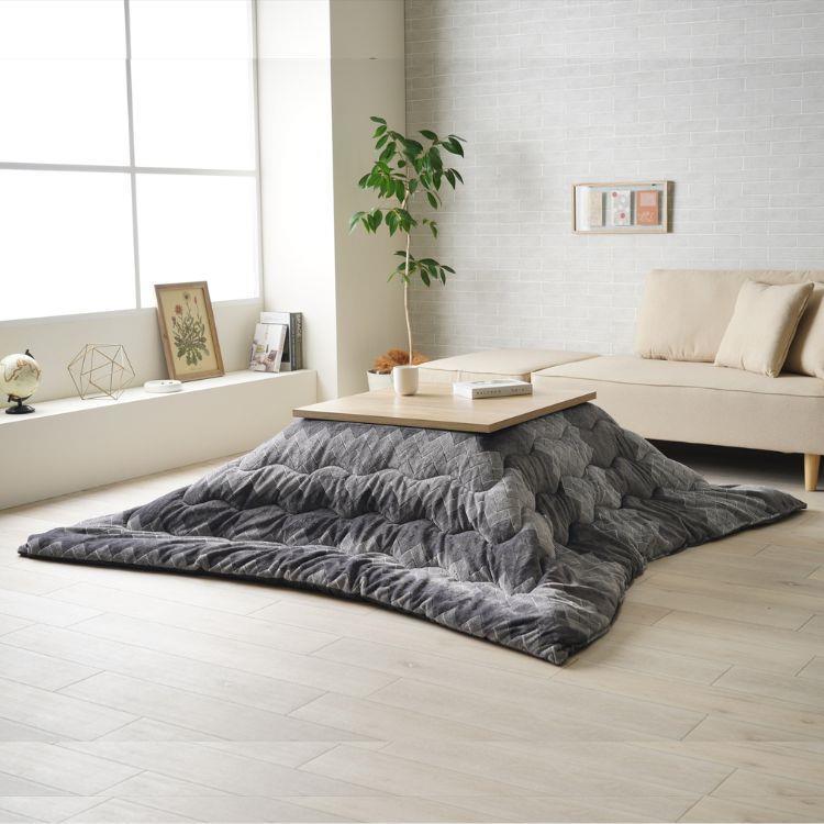 手触り滑らかなこたつ薄掛け布団です。ふわふわフランネル素材で、先染めジャガードで表現されたグラデーション幾何柄とシックなグレー色が、モダンな空間を演出します。薄手なのでかさばらず、軽やかな使い心地です。
