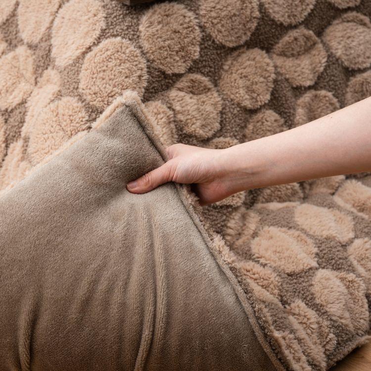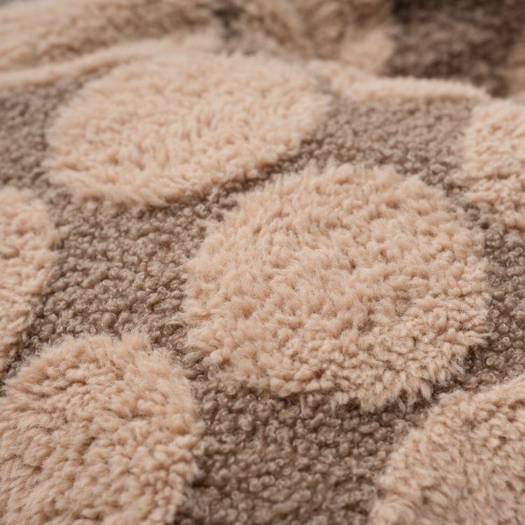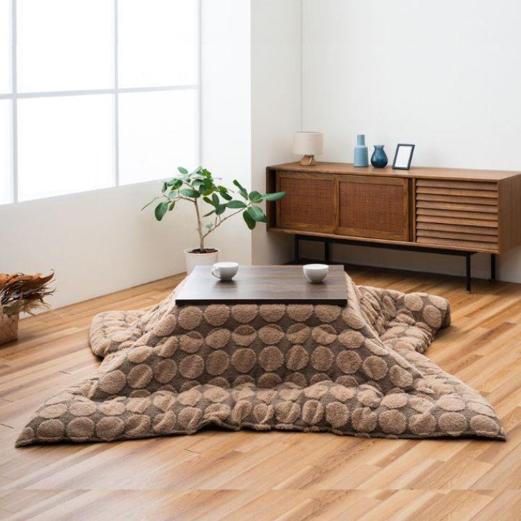 ラビット・ループ生地のふわふわ感が心地よい、こたつ薄掛け布団です。ジャガード編みのシンプルなサークル柄が、光と影で表情豊かに変化します。裏面はなめらかなフランネル生地で、肌触りも抜群。ブラウン色で温かみのある空間を演出します。