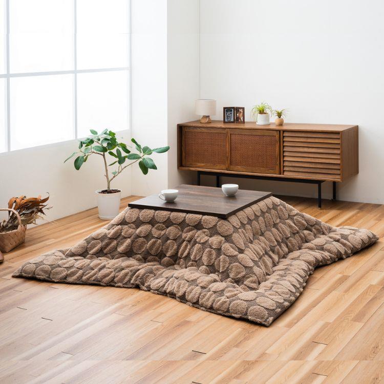 ラビット・ループ生地の柔らかな肌触りが魅力の大きめの薄掛け布団です。ジャガード編みで表現されたサークル柄が、光の加減で奥行きを感じさせます。裏面はフランネル仕様でさらにあたたか。落ち着いたブラウン色で、ゆったりくつろげます。