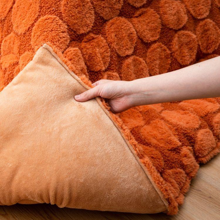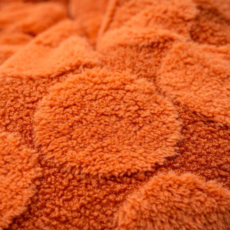 ラビット・ループ生地のふわふわ感がたまらない、大きめの薄掛け布団です。ジャガード編みのサークル柄は、見る角度で表情を変えます。裏面はフランネルでさらに心地よく。明るいオレンジ色が、お部屋に活気と暖かさをもたらします。