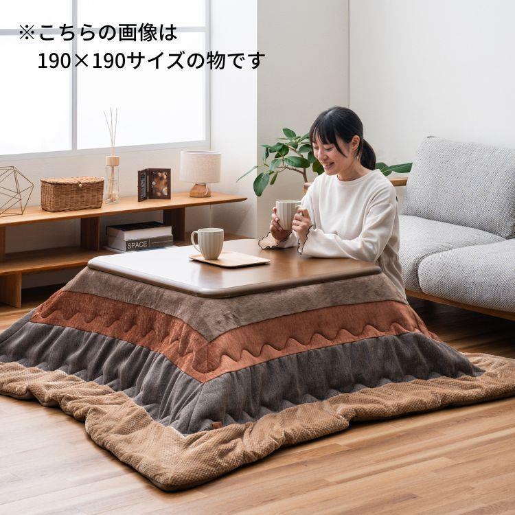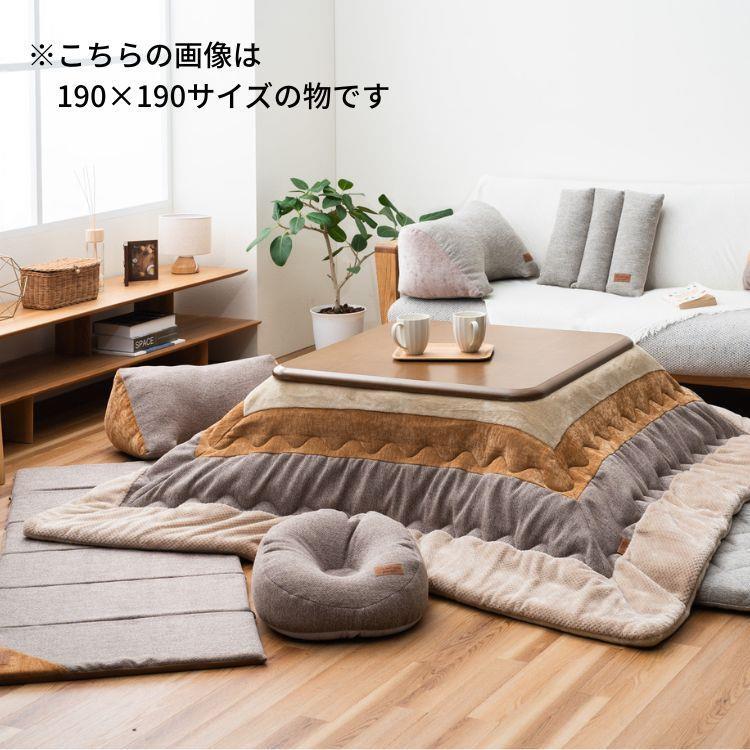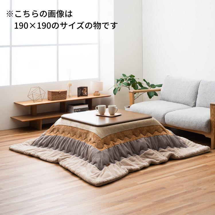 4種類の生地を絶妙なバランスでパッチした、大きめのこたつ用の薄掛け布団です。シェニールジャガードの高級感ある風合いと立体感が魅力。裏面は暖かいフランネル生地で心地よく、寒い日も快適です。落ち着いたベージュ色がお部屋に馴染みます。