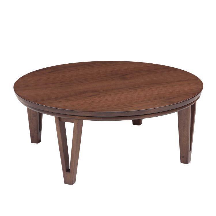 天然木天板の木目が美しいシンプルでお洒落な円形こたつです。和室にも洋室にもなじむデザインになっており、シーズンオフはセンターテーブルとして活躍します。シャープなデザインの三角脚が個性的な一品です。
