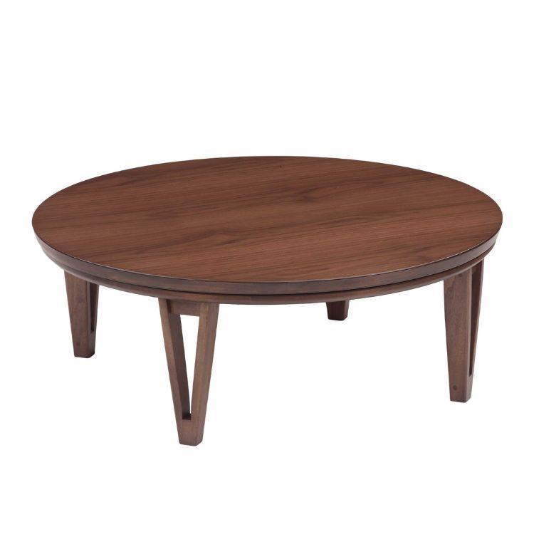 天然木天板の木目が美しいシンプルで大きめな4人掛け円形こたつです。和室にも洋室にもなじむデザインになっており、布団を外せばローテーブルとして活躍します。シャープなデザインの三角脚はお好みで脚の向きを変更することが出来ます。