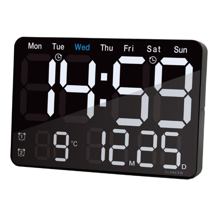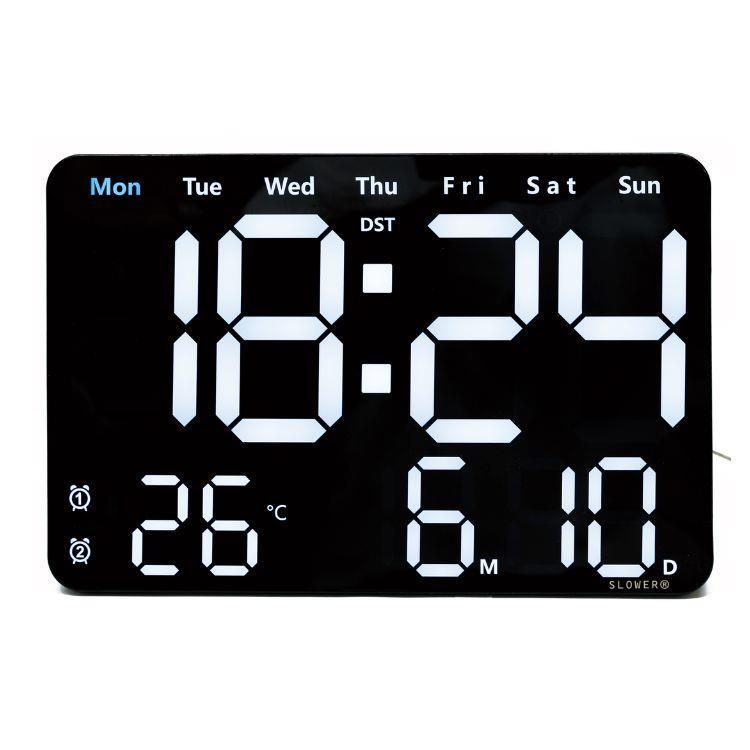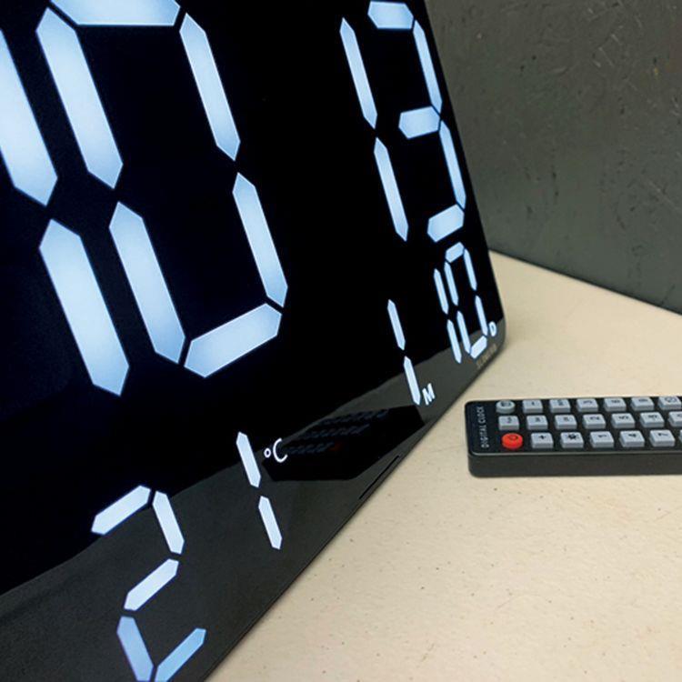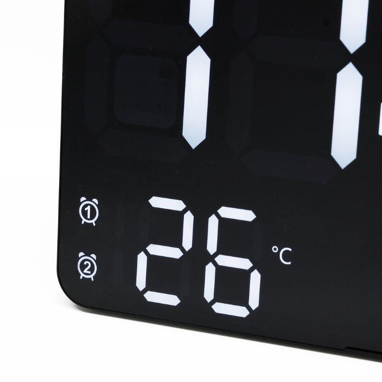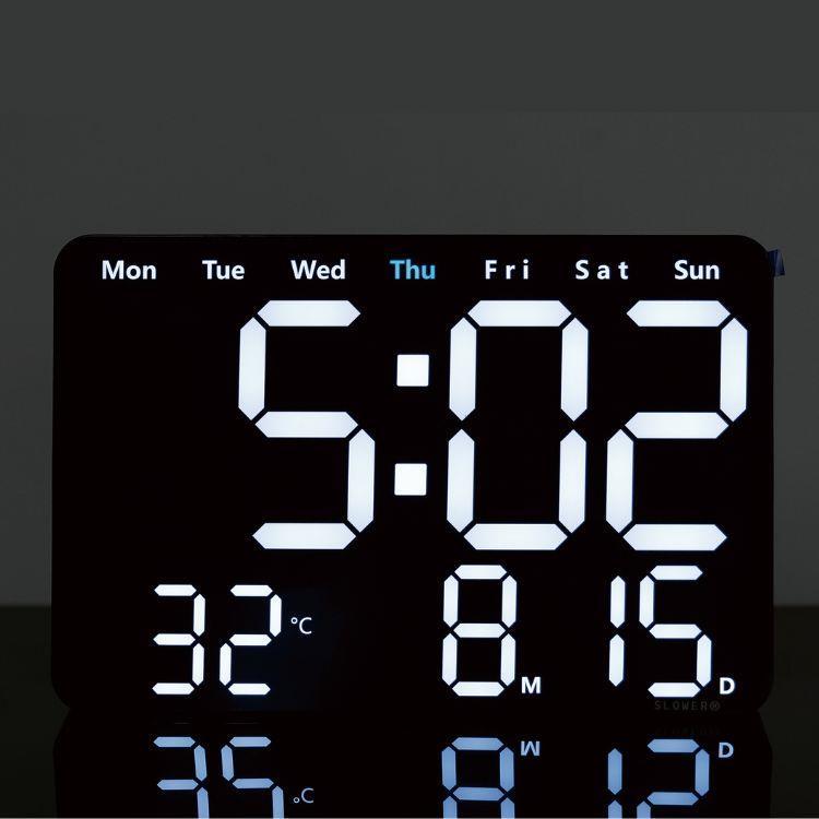 大きく見やすい表示で時刻・カレンダー・温度をひと目で確認できるLEDクロック。輝度は自動/手動10段階で細かく調整可能。置き掛け兼用にリモコン付きで操作も快適、空間になじむ洗練デザインです。
