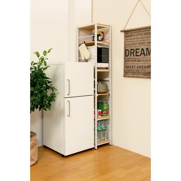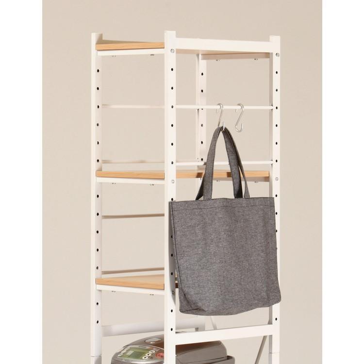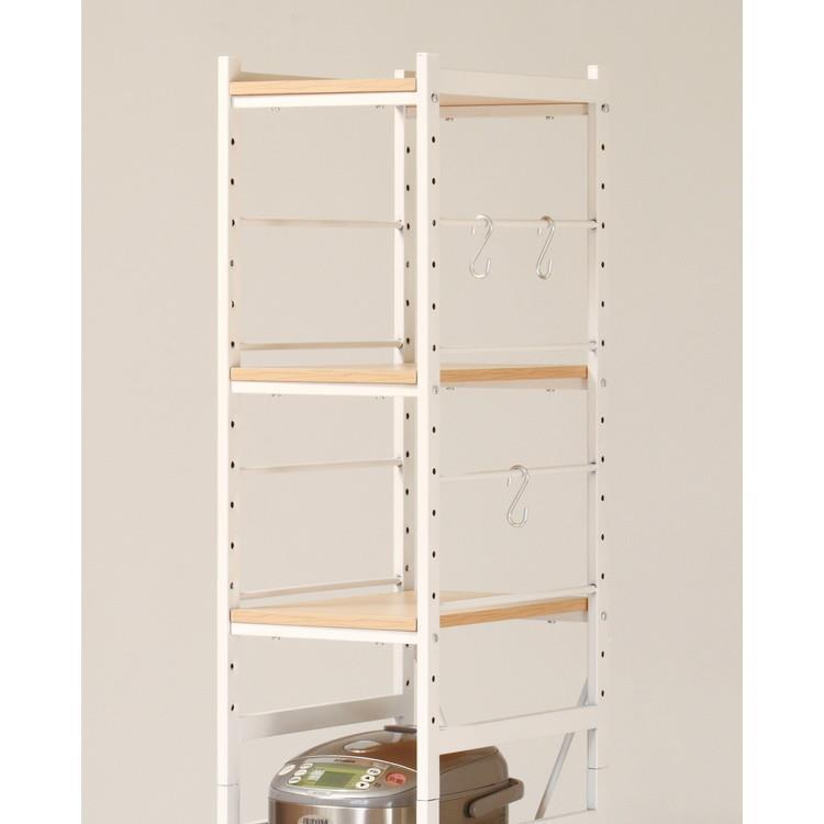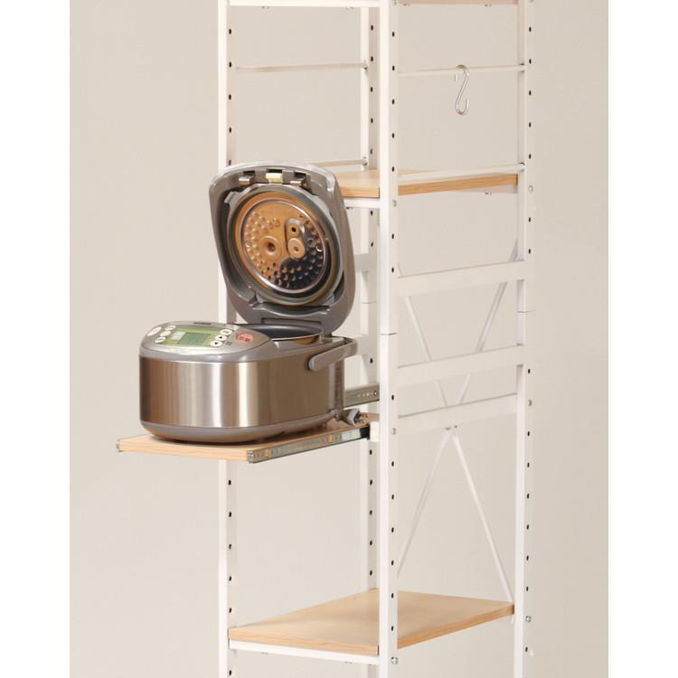 わずかなすき間にも置ける幅30cmのスリムなスチールラック。 棚板1枚はスライド式。炊飯ジャーなどの設置にも最適です。棚板・スライド棚板共に50mmピッチで任意の高さに設定可能。S字フックが3個ついているのでちょっとした物をサイドに掛けておくことができます。脚はアジャスター脚になっています。