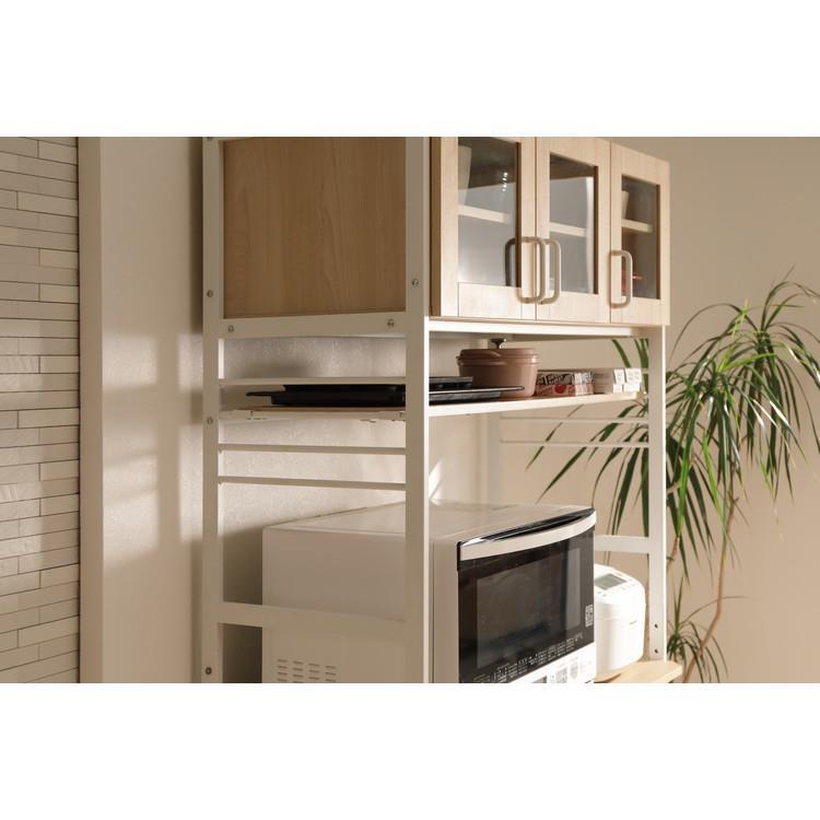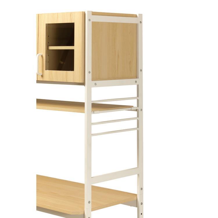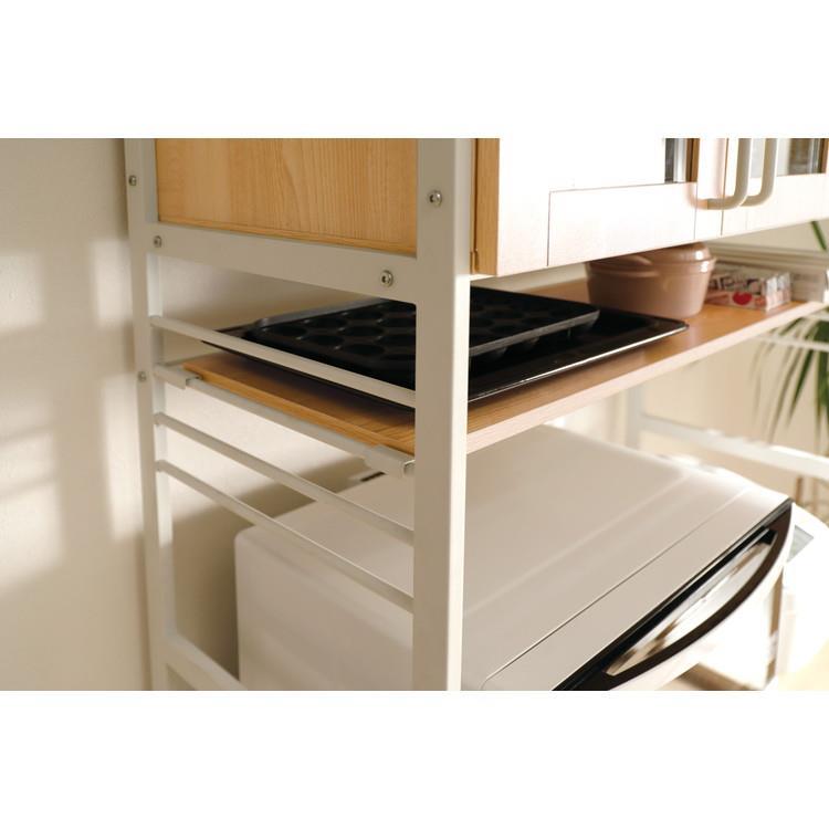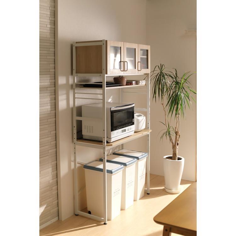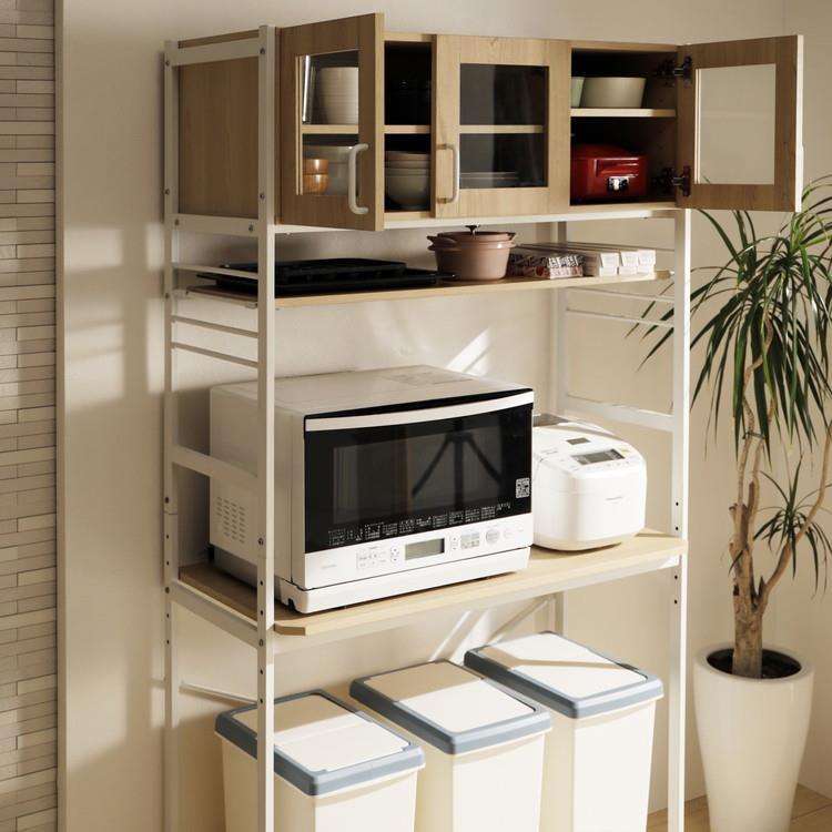 狭いスペースでも調理家電や食器・小物などの収納場所を確保できるキッチンラック。 中の棚は、収納する食器のサイズに合わせて5段階で高さ調整可能です。下段にはゴミ箱を2~3個置けるので、ゴミの分別もできます。
