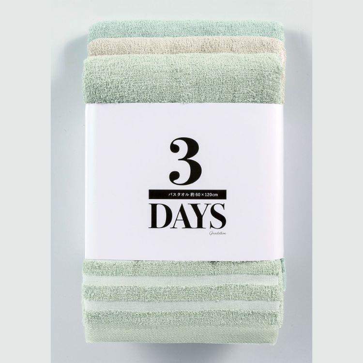 甘撚り糸を使用した、やわらかくふんわりとした肌ざわりのバスタオル3枚セット。爽やかなグリーンカラーで毎日のバスタイムを心地よく彩ります。洗い替えに便利な「3DAYSタオル」で、快適な暮らしをサポートします。