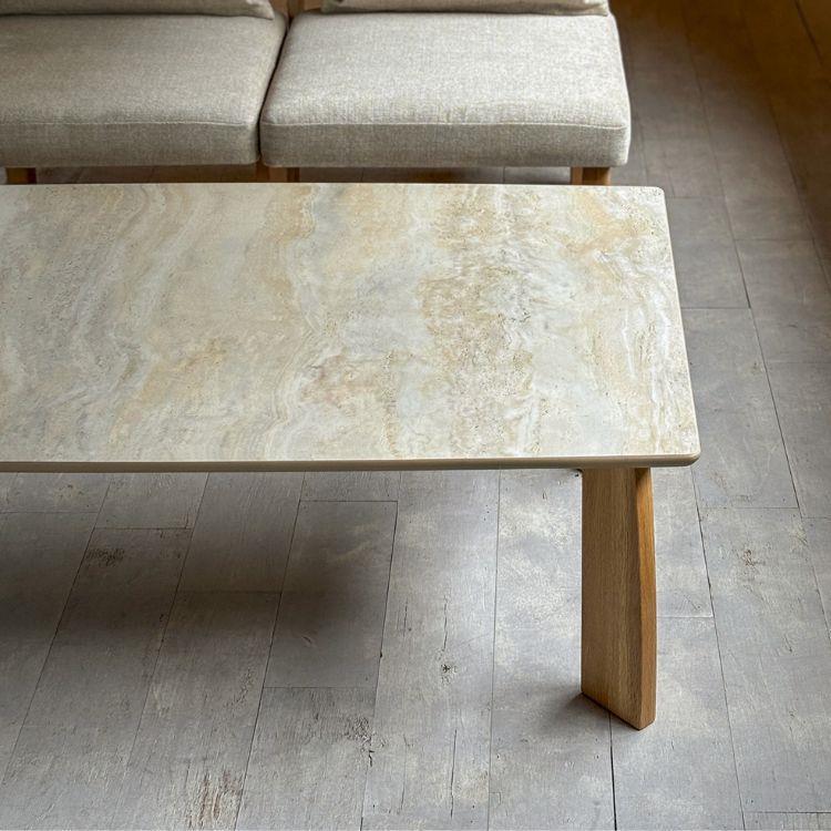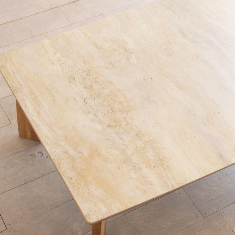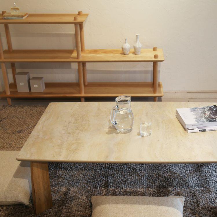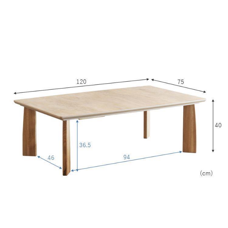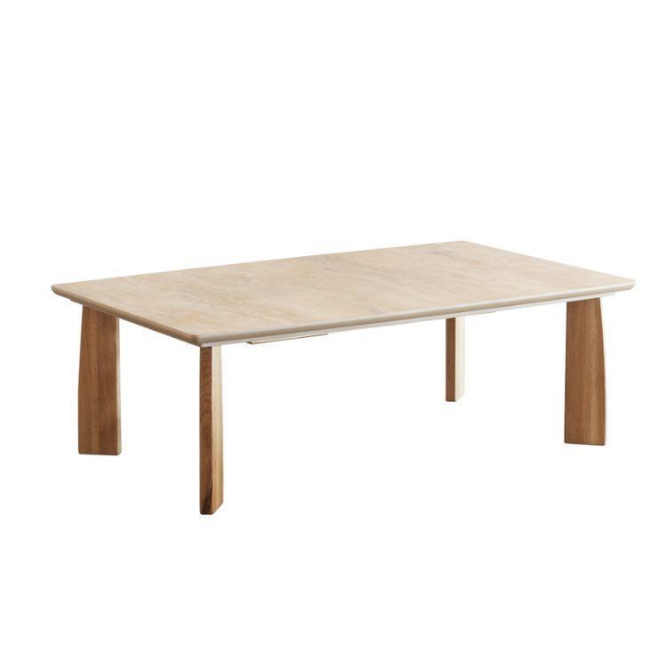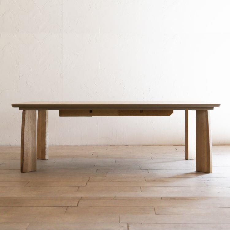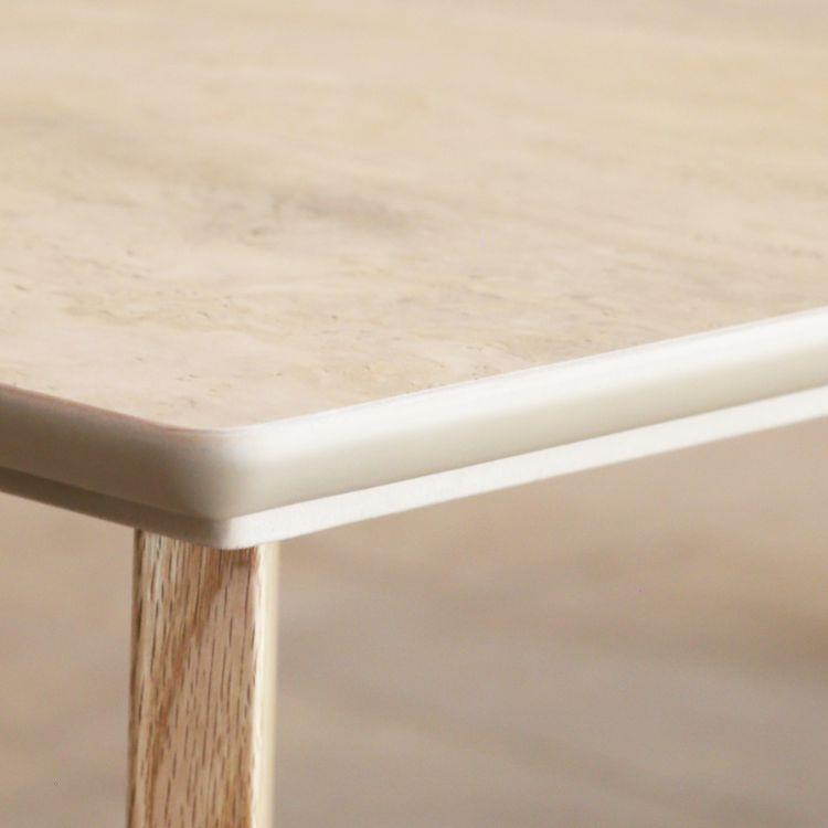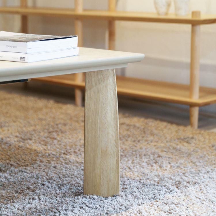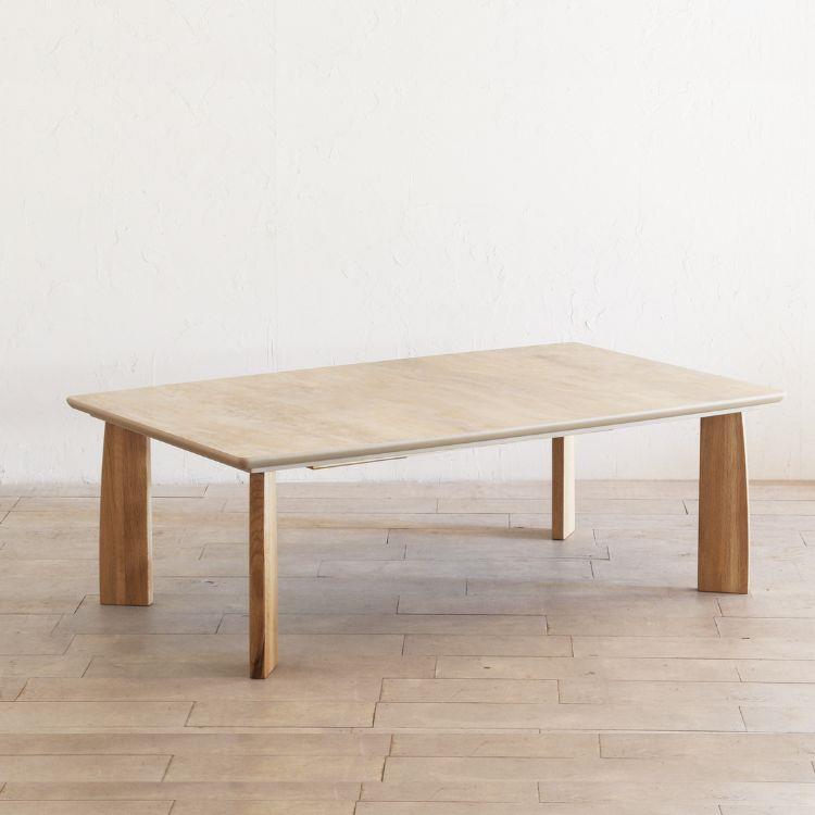 大理石調の淡い色合いの天板で、メラミン化粧板を使用しています。熱や水、汚れに強い性質を持ち、機能性にも優れているので、1年を通してリビングの主役になるコタツテーブルです。脚はスッキリとした印象かつクリアナチュラル色に仕上げています。