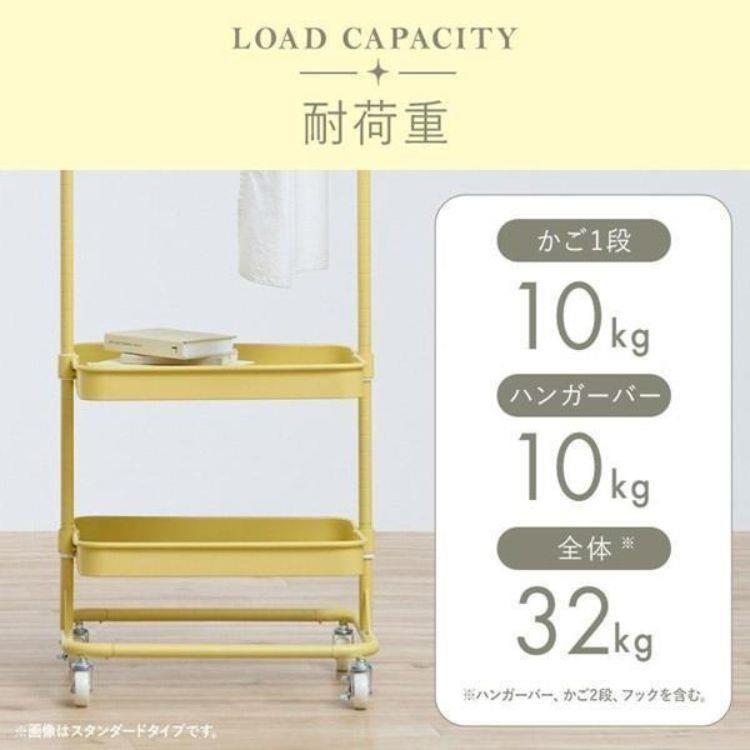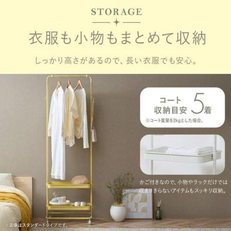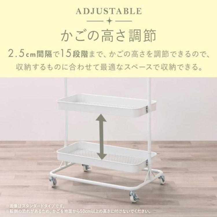 衣類も小物もこれ一台に。高さ調整できるハンガーと15段階可動のかごで、収納に合わせて自在にアレンジ。スリム設計ながら長い服もすっきり掛けられ、キャスター付きで移動もラクラク。使い勝手にこだわったハンガーワゴンです。