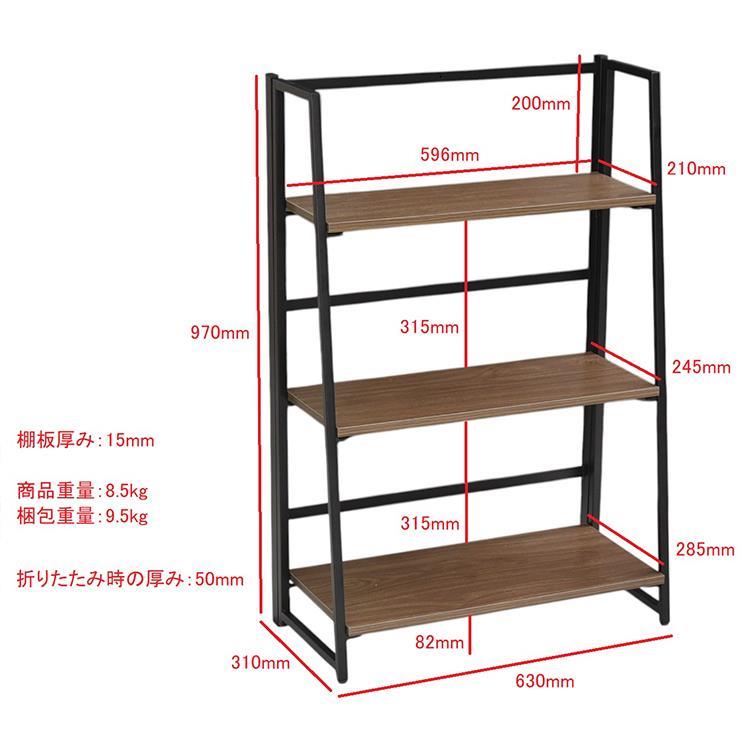 工具いらずでパッと広げてすぐ使える、折りたたみ3段ラック。幅63cmの省スペース設計ながら耐荷重10kgでしっかり収納。使わない時は奥行5cmにスリム収納、ブラック/ブラウンの2色で空間になじみます。