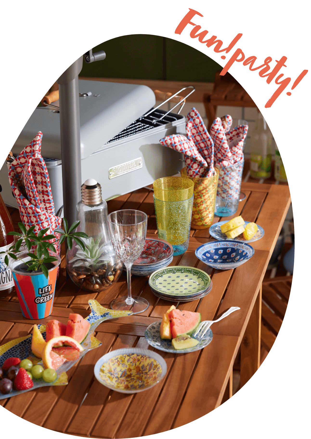 にぎやかな涼し気なテーブルウェアにフルーツを飾り