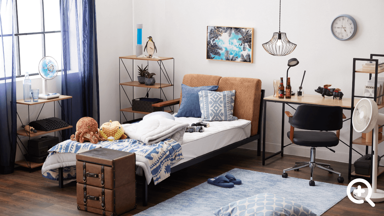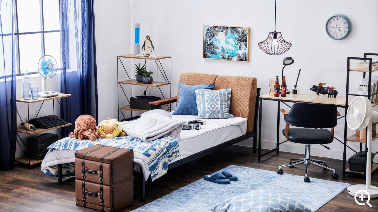 ひんやり快適にしてくれるアイテムを取り入れた 夏のお部屋。 ブルーをメインに、涼し気な空間を演出。 インテリアで遊び心をプラス。